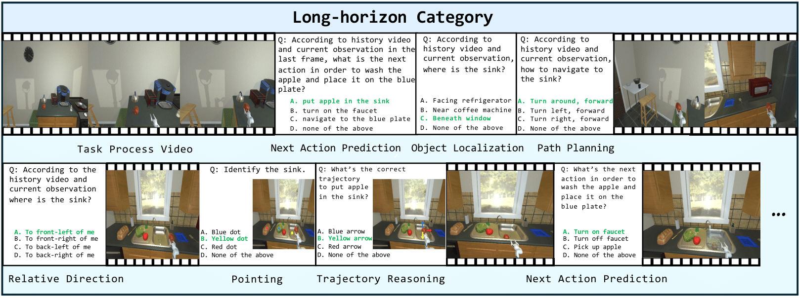 Long-horizon category decomposes embodied episodes into skill-oriented steps for offline evaluation. This category includes 35 episodes from AI2-THOR, each annotated with structured skill steps. As shown in the image, `put the apple in the sink' is broken down into planning, object search, navigation, spatial reasoning, perception, and placement. Each step maps to an atomic skill in BEAR, demonstrating that our taxonomy is practically grounded in embodied tasks.